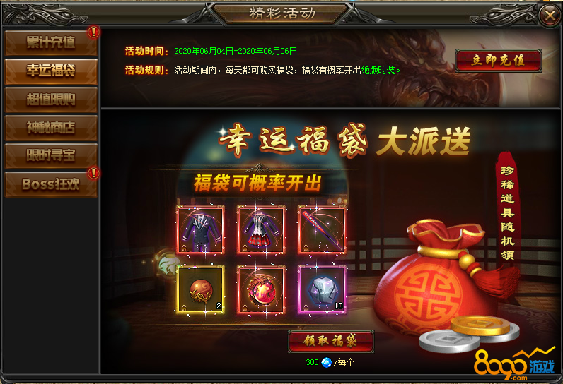 规则:可花费钻石购买福袋,每个玩家每天最多可购买20个。