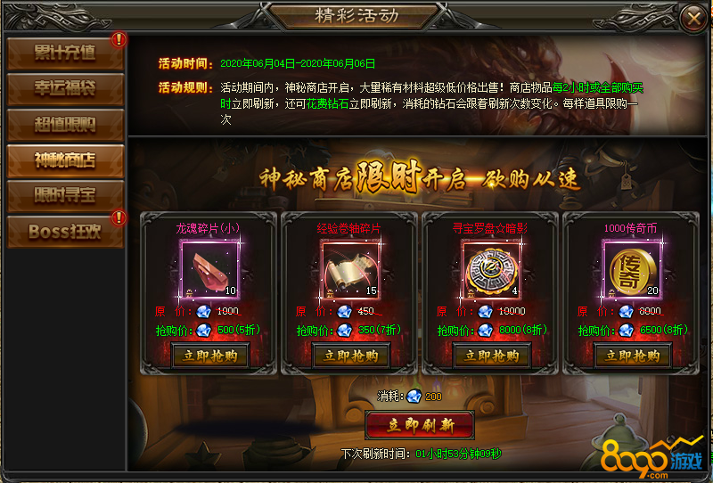 规则:每隔2小时神秘商店将会刷新各种市面上难以获取的珍贵物品