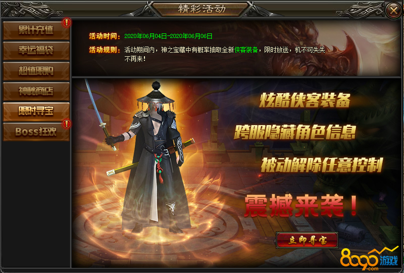 规则:活动期间,神之宝藏中有几率抽取全新侠客装备。穿戴侠客装备后,参加跨服活动可以隐藏角色信息。同时能够解除任意被动控制技能