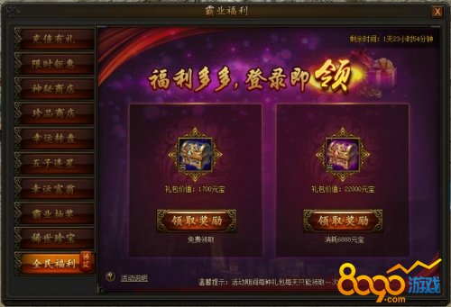 活动期间,80级及以上玩家登录即可领取免费礼包,花费一定数量元宝还可购买超值礼包,每个角色每种礼包每天只能领取一次!