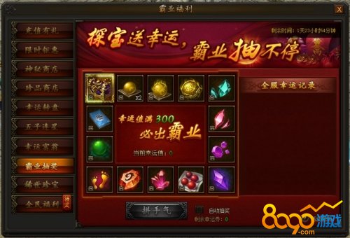 活动期间每探宝十次即送一张幸运券,可用于参与霸业抽奖,有机会获得海量材料和霸业装备!每次抽奖即可获得一点幸运值,幸运值达到300点抽奖必出霸业装备箱!