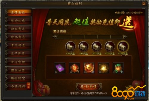 活动期间,充值元宝即可领取五档丰厚奖励,每天均可领取一次,不容错过!