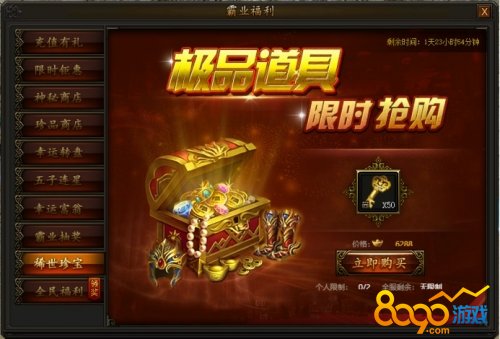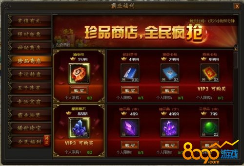 活动期间,每天会随机刷新一批特价道具,花费少量元宝即可购买,每个道具均有每天最大个人购买次数限制,部分道具有购买vip等级限制,买到就是赚到,机会不容错过!