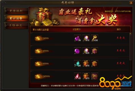 活动期间,累计消费一定数量元宝,即可领取对应档奖励,每个角色只能领取一次。