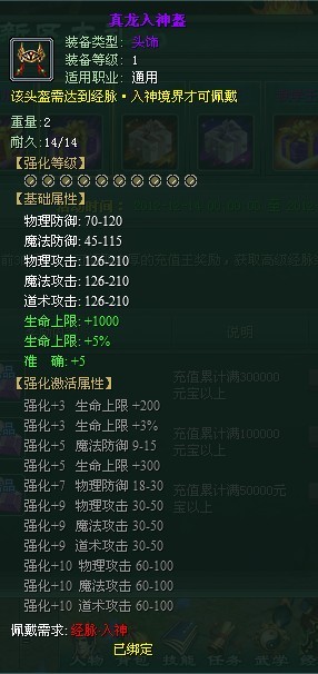 活动期间内,累计充值第一,可以获得【九品强化石】*1、极品头盔【真龙入神盔】*1(需满足活动期间内累计3000以上的充值)