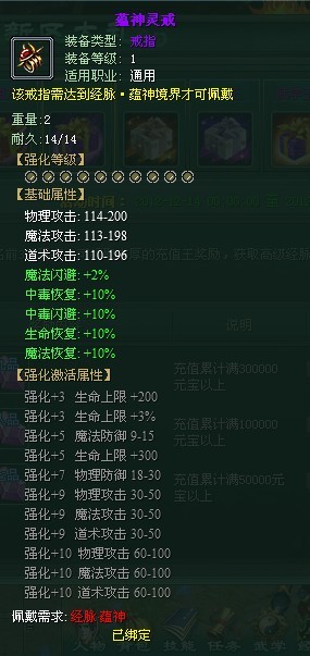 活动期间内,累计充值第二,可以获得【八品强化石】*1、【蕴神灵戒】*1(需满足活动期间内累计1000以上的充值)