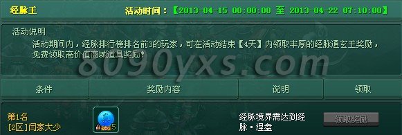 活动内容:活动期间内经脉进度排名前3的玩家可免费领取经脉通玄王豪华奖励,灵力无限放送!
