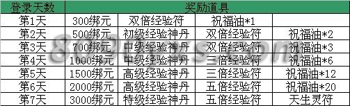 积分好礼第二重:活动期间每300充值积分可兑换以下礼品,每兑换1次扣除300积分,可重复兑换:七品强化石*1、六品强化石*1、双倍经验符*1、金蛋*2