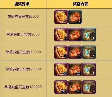 活动内容:活动期间,单笔充值元宝满足条件即可获赠超值道具!