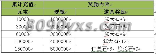 注:累计充值满150000元宝后,每当在前一次基础上累计充值再满50000元宝,均可获得包含5000000现银、仁皇石*6、绝炎石*9的礼包一份。