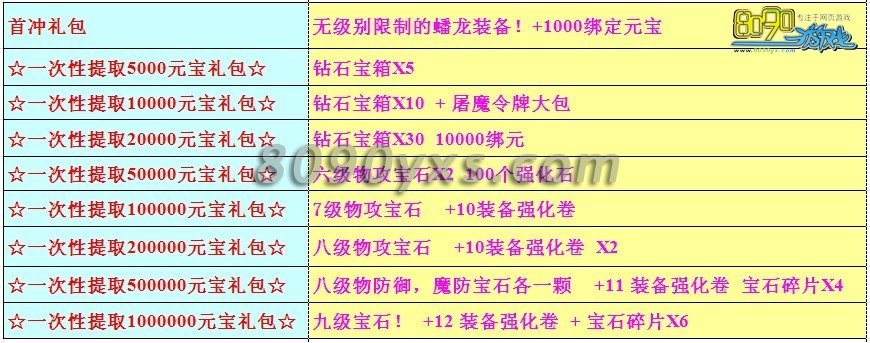 搜索"8090网页游戏"活动一、一次性充值礼包