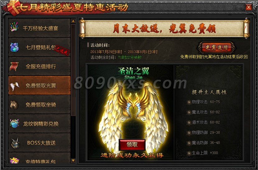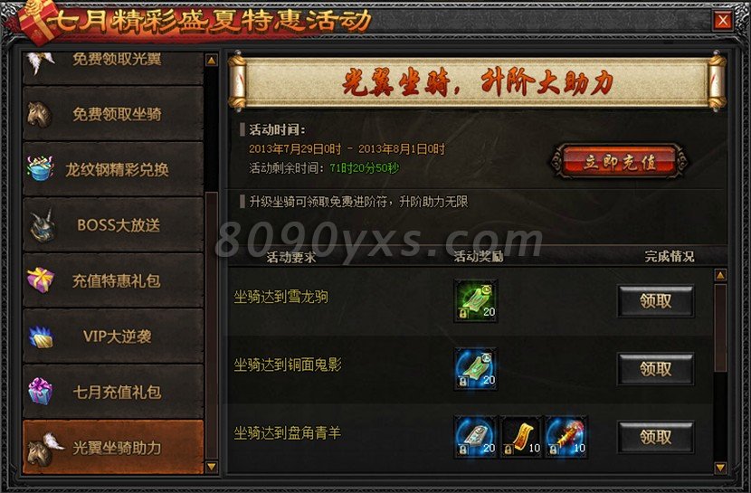活动规则:活动时间内,玩家的坐骑或光翼达到一定的阶数,即可领取相应的奖励。免费试用还不够,月末答谢活动助您再上一层楼。紫斑烈兽、冰霜飞麟不再是梦,光明之翼、圣洁之翼触手可得。