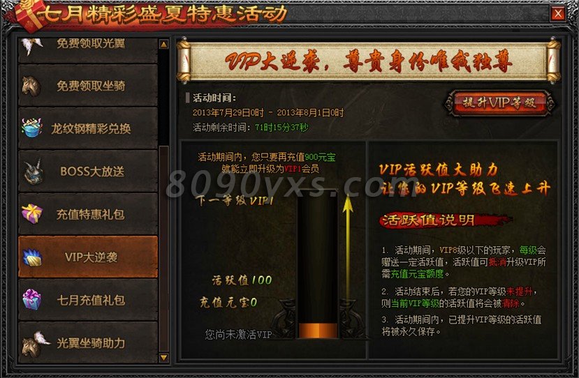 活动规则:活动期间,赠送所有玩家升级VIP活跃值,少付出最多20%元宝即可升级VIP!心动不如行动,快来升级吧!