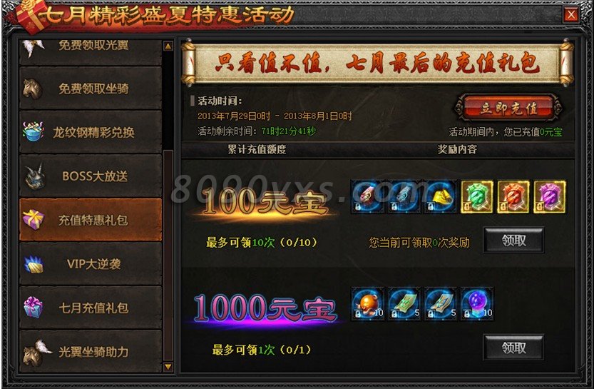 活动规则:每充值100元宝即可获得“月末充值特惠礼包”