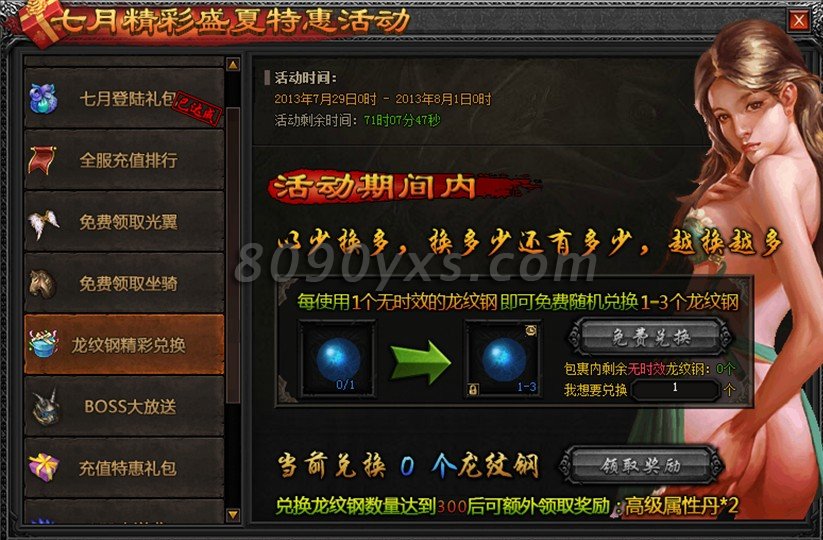 活动规则:活动期间内玩家使用“无时效的龙纹钢”在活动面板免费兑换“有时效绑定的龙纹钢”,每兑换一个均有一定概率额外获得1-3个。兑换个数累计达到300个可额外领取高级属性丹*2