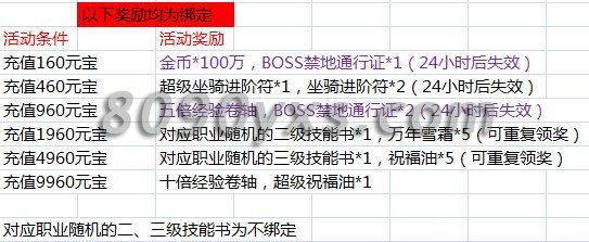 活动奖励:首充勋章*1,等级提升丹*1,对应职业极品属性首饰1套,对应的职业黄金武器*1,气血石(大)、第二日礼包