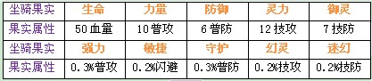 喂养至三阶的玩家,可获得坐骑果实:生命*5、力量*5、防御*5、灵力*5、御灵*5。