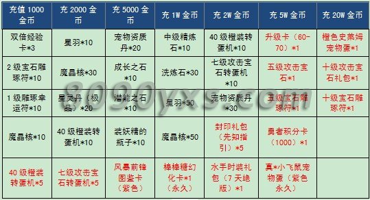 首充礼包内容(价值6888金币):天使之羽*1,升级卡*1,银币(10W)*10,极品星灵丹*10,1级攻击宝石*10,史莱姆T恤礼包*1(7天),棒棒糖嘴礼包*1(7天),成长之石*2,潜能之石*2,双倍经验卡*1,星羽*5升级卡:每个账号一辈子只能用一次,50级-59级期间能够使用,使用后可直接升一级哦!