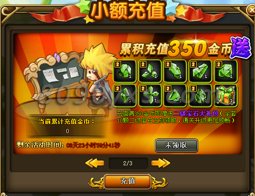 累计充值350金币:二级宝石大礼包(全套10颗二级宝石立刻领取,通关升级更加顺畅)