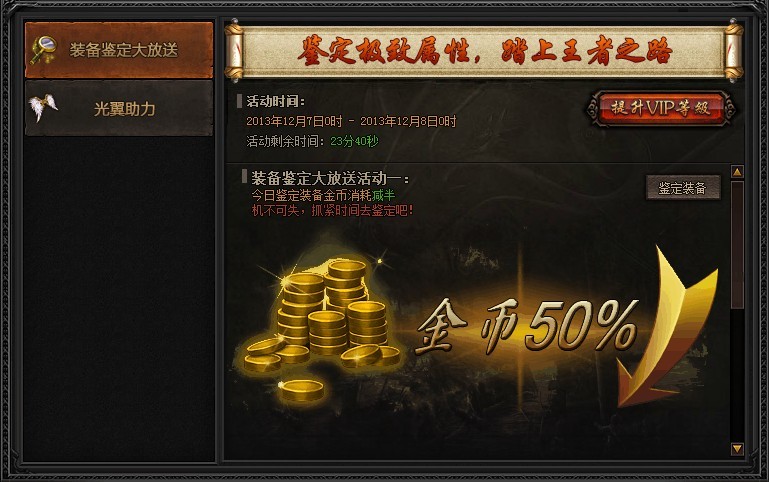 2. 活动期间内,玩家VIP等级≥5即可领取40个40级装备鉴定卷和20个45级装备鉴定卷(非绑定)。