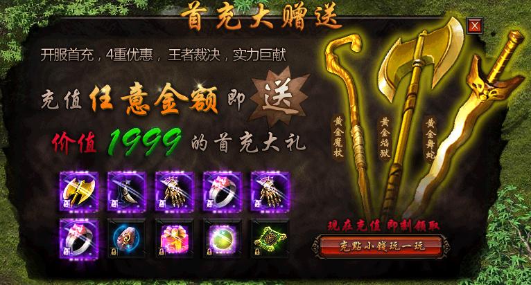 活动奖励:首充勋章*1,等级提升丹*1,对应职业极品属性首饰1套,对应的职业黄金武器*1,气血石(大)、第二日礼包