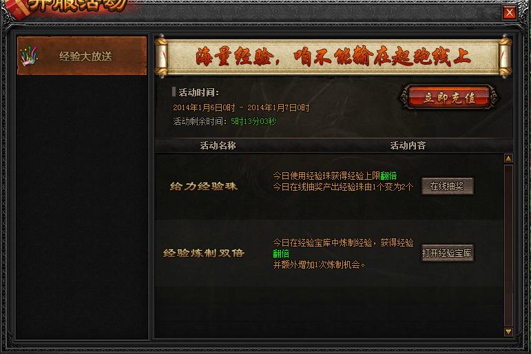 活动内容:在活动期间系统开放双倍经验,活动所有玩家都将获得双倍经验,配合多倍经验卷轴可获得更高的经验。