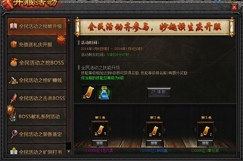 1.全名活动之技能升级:活动期间,技能等级达到6级即可领取“挖掘灵符”、“疾风药水”!前三名还有额外奖励哦~~
