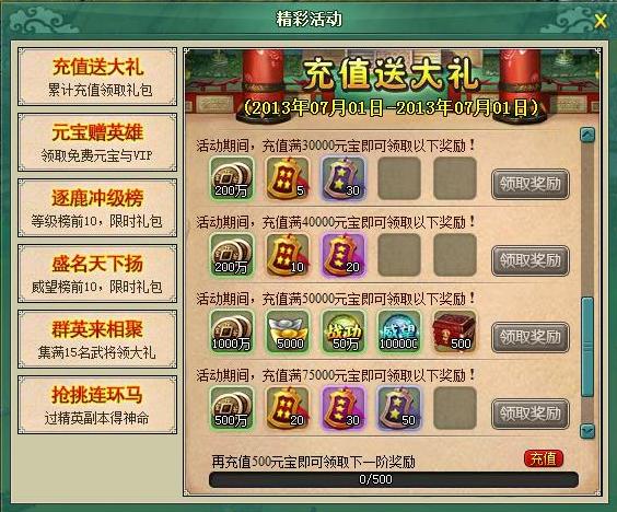 累积充值满500元,可获得100w铜钱、500元宝、50000战功、10000威望、50个材料宝箱