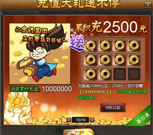 10、给力的,总是姗姗来迟,充值累计2500元,奖励金币天文数字!
