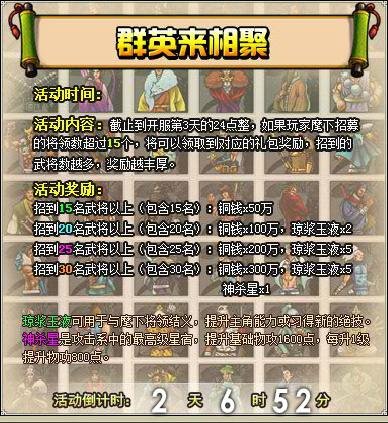 招到30名武将以上(包含30名):铜钱x300万,琼浆玉液x5,神杀星x1