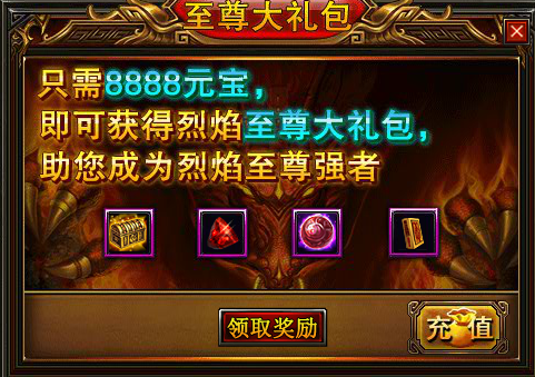 礼包内容:至尊大礼包(8888元宝):超级金币箱x1 + 神石碎片x1 +战魂珠(大) + 三倍经验(8小时)