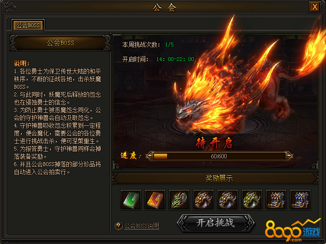 搜索"8090网页游戏"传奇霸业的公会系统一直都是做的非常好的,也一直深受广大玩家喜爱。公会中有很多方便玩家的系统,比如公会仓库;也有一些能稳定提升玩家战力和属性的系统,比如神兵阁、公会技能;当然也少不了福利系统,比如祈福祭坛、公会任务以及今天要介绍的公会BOSS。