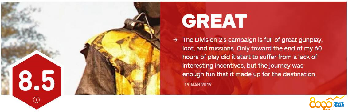 搜索"8090网页游戏"《全境封锁2》是一款由育碧制作的共享世界设计游戏,IGN给出了8.5分的最终评分,《全境封锁2》的战役充满了精彩的枪战和丰富的战利品,游戏还拥有优秀的任务系统,不过终局游戏并没有提供足够的奖励来激励玩家继续进行游戏。