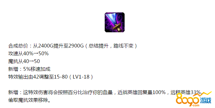 攻速从原本的百分之40上升到了百分之五十,魔抗也从40增加到了五十并且新增属性增加百分之五的移动速度,特效输出由42调整至15-80也就是变成了一个成长性装备,同时虽然移除了偷取魔抗效果但是增加了吸血能力不过好像也不是很多。