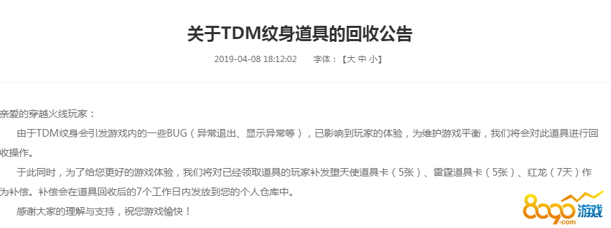 因为这个TDM纹身的道具在使用的过程中出现了一些BUG,导致玩家们没有办法正常的进行游戏。所以CF重新收回TDM纹身。这个本来就是CF玩家们领取的福利,这就被收回了,也太不公平了吧。这部CF为了玩家至上的观念,给玩家们送了一些道具来赔偿玩家们的损失。玩家们在一个星期之内在自己的仓库中寻找哦。