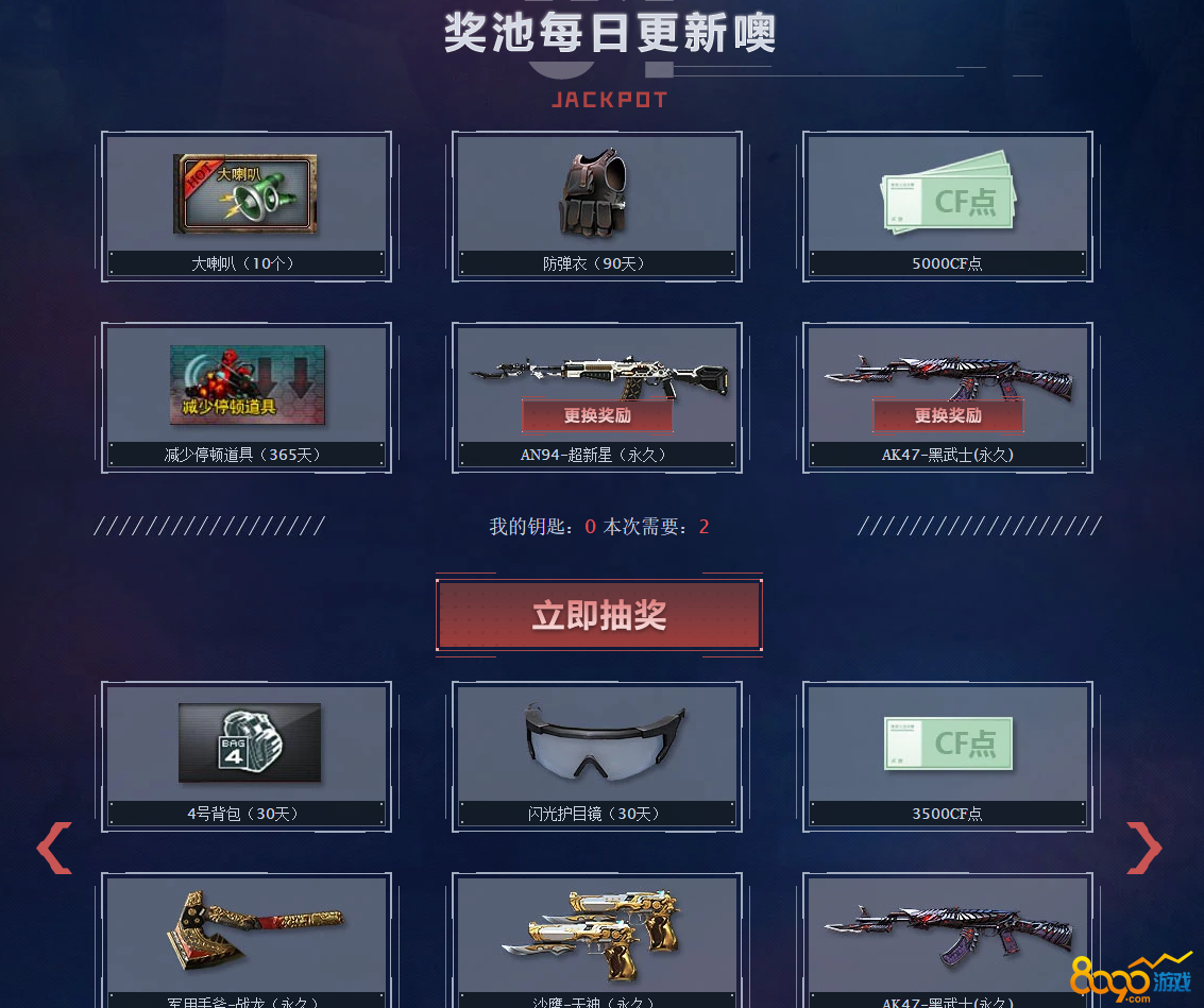 穿越火线游戏中每日一抽是我认为火线中抽奖最划算的活动了,没有之一。首先他价格公道其次他送的武器装备都是非常实用的,而且每日一抽中每天展示6种奖励,奖励每日零点更新,彩蛋每日清空,每天抽奖前两个顶级奖励可以自己选择,这意味着比如玩家喜欢毁灭和雷神,把这两个选为顶级,但是今天系统刷新的是黑骑士和黑龙,那么玩家就可以免费将顶级奖励更换,做到应有尽有的服务。已经获得的道具存放在暂存箱中,可选择分解成cf点或发往游戏仓库,已发往仓库的道具无法退还,超过活动期间的钥匙会作废的哦。