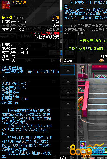 搜索"8090网页游戏"冰火之莲是dnf端游中的史诗武器手弩,在神枪手职业角色等级达到85级以上时便可以进行使用。获取方式为:在84~91级深渊地下城怪物掉落或者在攻坚队完成安图恩团队模式的《消灭安徒恩》任务时获得该奖励,下面就和小编一起来看看这件装备的具体属性如何吧。