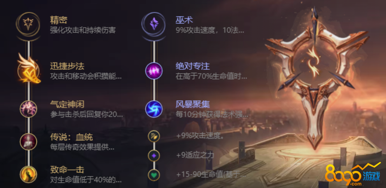 副系巫术系:绝对专注-风暴聚集。卡莎无论是在线上还是团战前,都会利用W技能去进行消耗,点出绝对专注能够有效提高卡莎的Poke伤害。风暴聚集对于卡莎这类中后期的C位提升也是比较明显的,能够获得可观的攻击或法强收益。