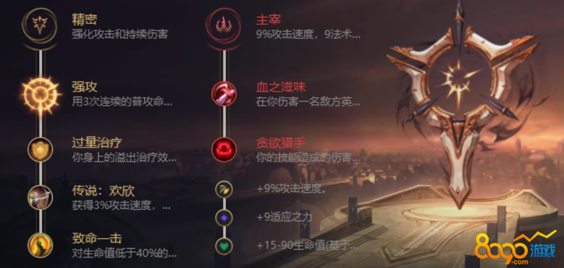 副系主宰系:血之滋味-贪欲猎手,标准的主宰副系双吸血天赋,这个组合一旦出现,意味着线上打法一定是以激进和换血为主的,血之滋味在小规模遭遇战中产生击杀还能回血,给予VN更多的操作空间。