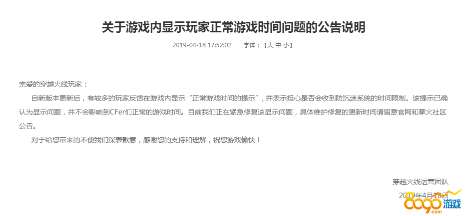 这个是更新出现的问题,虽然显示正常游戏时间的提示,但是丝毫不会影响玩家们玩CF游戏。大家和我一起看一下CF官方发出来的公告吧,目前CF官方已经在修复这个漏洞了,大概明天的时候就会修复好的。玩家们不用担心,不会出现强制下线的现象的哦。