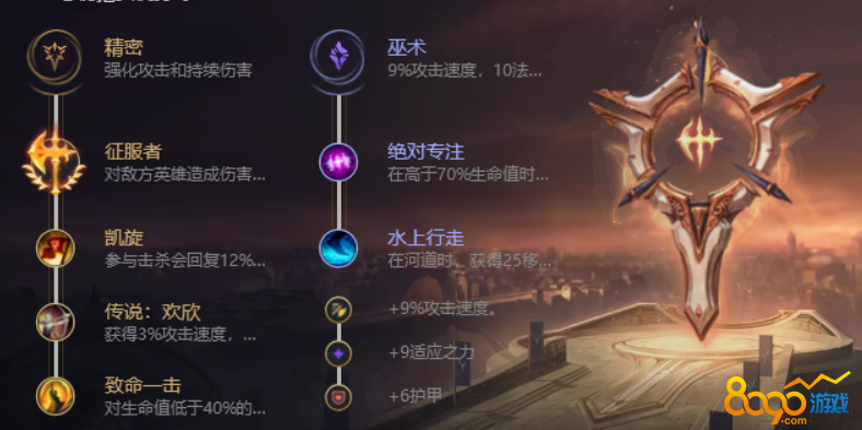 副系巫术系:绝对专注-水上行走,打野点出绝对专注,能够增加Gank时的爆发伤害,毕竟打野Gank前大多是能够保证自己的良好状态的,水上行走增加跑图能力。