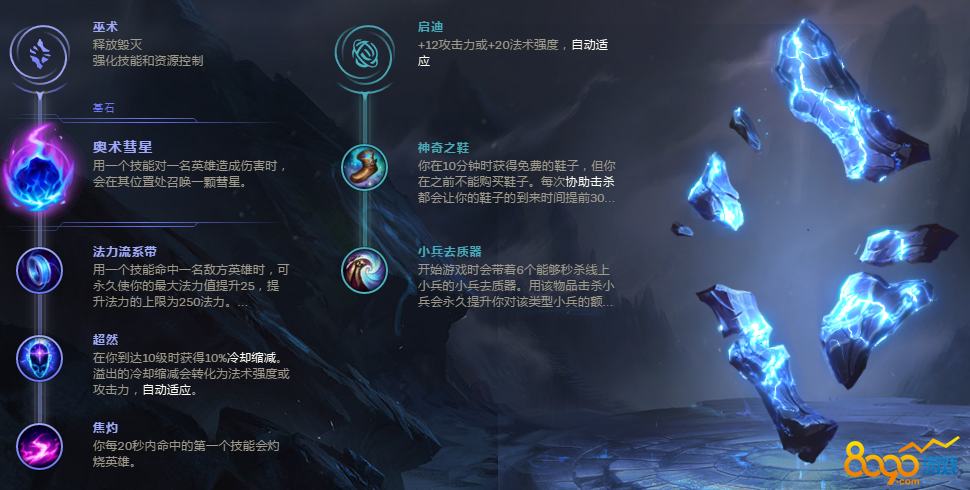 英雄联盟野区半肉AP石头人还是推荐主巫术,副启迪,奥术彗星和焦灼保证线上消耗能力,法力带保证回家后蓝量和少许回蓝超然保证大招CD,终极技能帽被移动到主宰系,而石头人不适合点主宰系,鞋子等于免费300经济对发育很关键的,小兵去质器保证抢等级、推线和补兵发育。