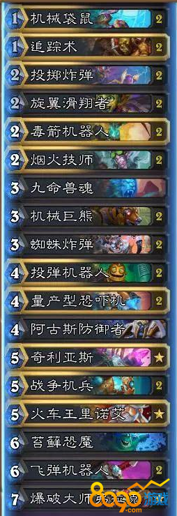这套猎人是在机械猎的基础上作为改进,加入了炸弹的体系,目前已经有玩家用这套卡组上了传说,可见其强度之高,卡组思路非常简单:铺炸弹,通过各种机械的磁力,触发炸弹的亡语,可以说是一套快攻体系的卡组。