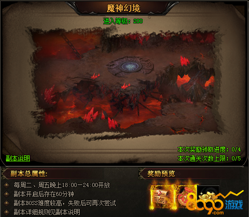 多人副本需要角色等级到达200级然后组队进入。副本开放的时间是周二和周五的18点到24点。开启副本之后,副本会存在60分钟,副本失败后可以在副本开启时间段内继续组队闯关,次数无上限。副本内死亡可以选择复活,复活会消耗团队复活次数,总共是5次,消耗完之后则判定副本失败。副本内每个boss奖励只能领取一次,再次通关后无法获得奖励。另外需要提醒大家的是副本内的恢复效果会降低50%,另外“焚天屠龙”称号的特效触发概率会减低。