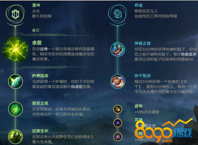 泰坦的符文建议是余震、护盾猛击、复苏之风、过度生长、神奇之鞋、饼干配送。属性符文一个法强一个攻速一个抗性,泰坦是一个需要普攻来触发被动和W技能的英雄,前期有更高的攻速也更方便补刀。