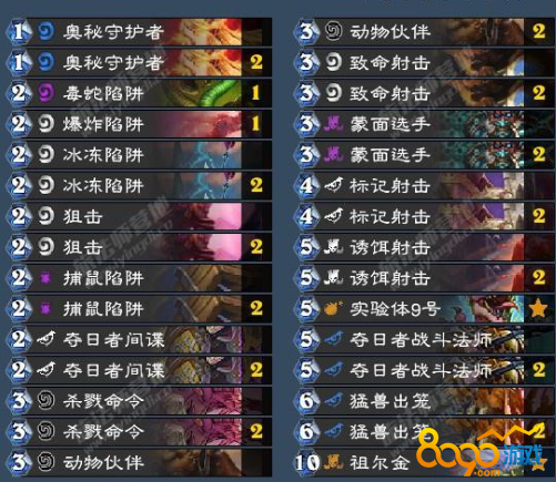 猛兽出笼就不必多说了吧,猎人版本最强卡没有之一,必须满编。目前天梯中很少有人玩纯奥秘体系的猎人,大家可以拿去试试环境,强度还是很可观的。