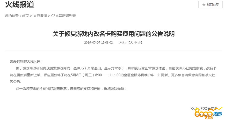 改名卡在5月8日的11点之后将会重新上架,玩家们在今天更新结束之后,可以去商城里面看一下改名卡哦。多购买几张改名卡,万一CF再出现bug,你们说是不是呢?玩家们可以和小编一起看一下改名卡的重新上架的公告哦哦,小编为大家截图了哦: