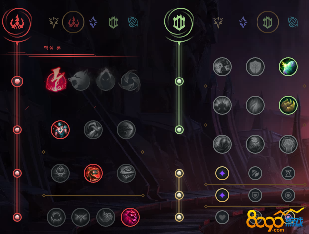 主系选择主宰系电刑-恶意中伤-幽灵魄罗-终极猎手,主系符文的搭配如上所说,笔者在这里就不再多作解释了,这里主要说一下副系符文的选择,副系选择护盾猛击和加强过的骸骨镀层,让塞拉斯在换血上更加占优势。