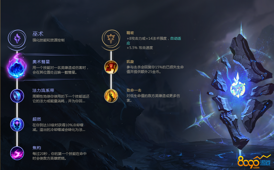 英雄联盟佐伊还是推荐主巫术副精密的符文搭配,首先奥术彗星能让佐伊在对线中有很好的消耗能力,法力流系带毋庸置疑在对线的时候能够提高佐伊赖线的能力,超然在10级是有个10%的减CD能够让佐伊有个更好的满CD的状态,让他在团战的时候更有利的输出。焦灼同样能够提高线上的消耗能力。凯旋能够让佐伊在游走的时候保证一个更好的血量。致命一击提高斩杀的效果。