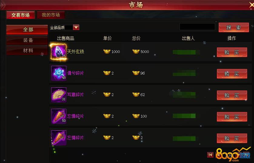 市场分为2个部分,分别是交易市场和我的市场。在交易市场中我们可以选择购买我们需要的装备和材料,而且为了方便我们快速的找到我们所需要的东西,市场还具有分类和搜索功能。分类里面可以选择品质、等级和部位,或者直接在搜索里面输入我们需要的装备和材料名称就可以直接找到我们所需要的东西了。